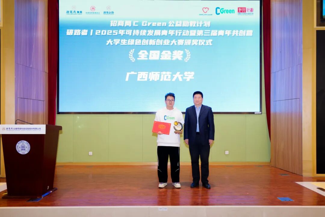 结营仪式上,12校师生代表队围绕“循环再利用”“生物多样性保护”“节能减排”“绿色生活方式”四大主题进行成果汇报、模型演示、专家评审答辩,充分展现了兼具创新性与实用性的绿色实践成果。最终,广西师范大学凭借“卫蓝使者——守护蓝色海洋的青年先锋”项目斩获全国金奖,该项目以推广海洋科普知识、增强民众海洋意识为核心任务,旨在打破海洋知识传播壁垒,让海洋生态保护理念深入人心,推动更多人参与海洋保护。